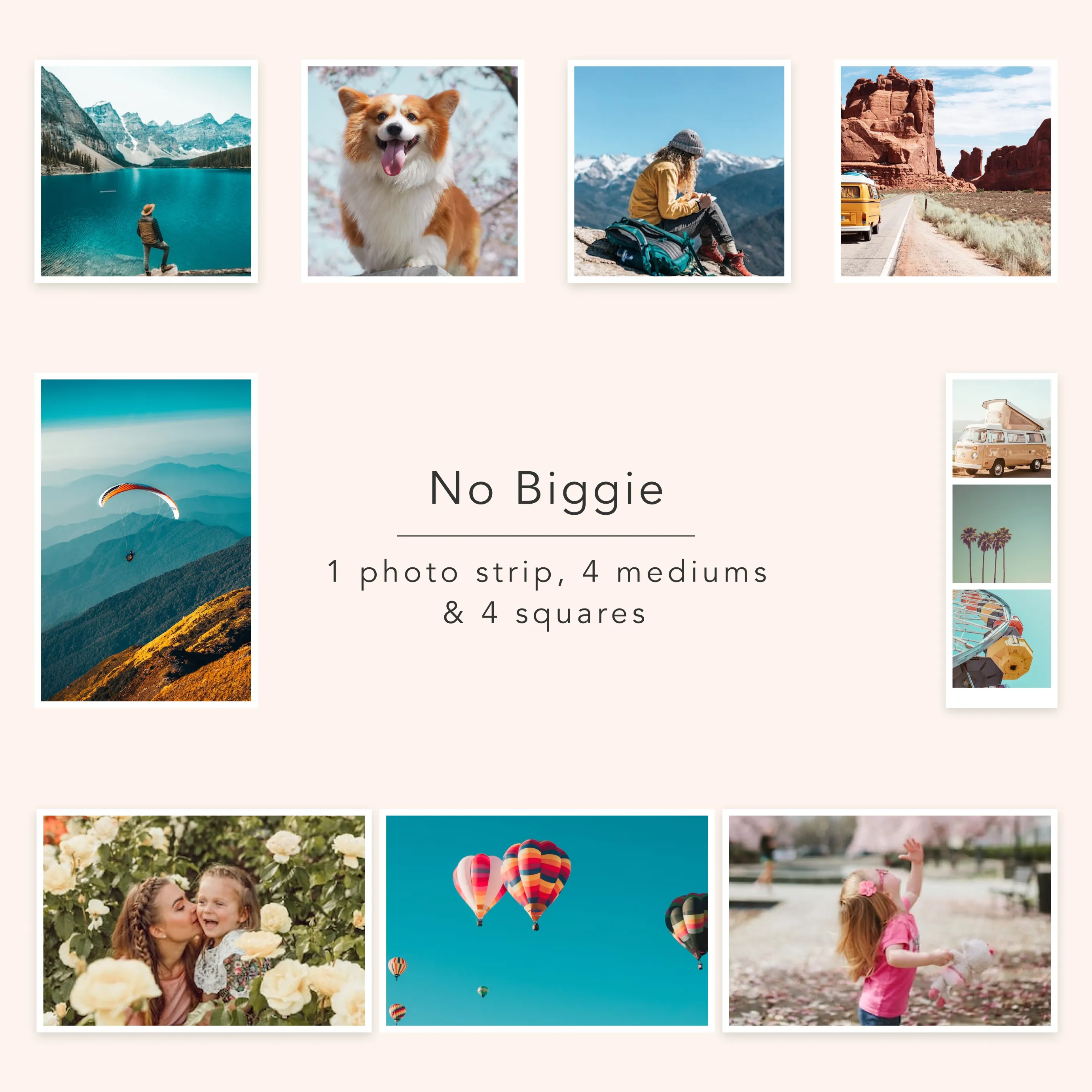 De No Biggie Set heeft onze twee populairste maten, het medium en vierkante formaat, én de schattige fotostrip! Je favoriete foto’s worden geprint met levendige kleuren, scherpe details en een stijlvolle witte rand. Daarbij worden je foto’s gratis en supersnel thuisbezorgd, zodat je eindelijk kan genieten van jouw foto’s!