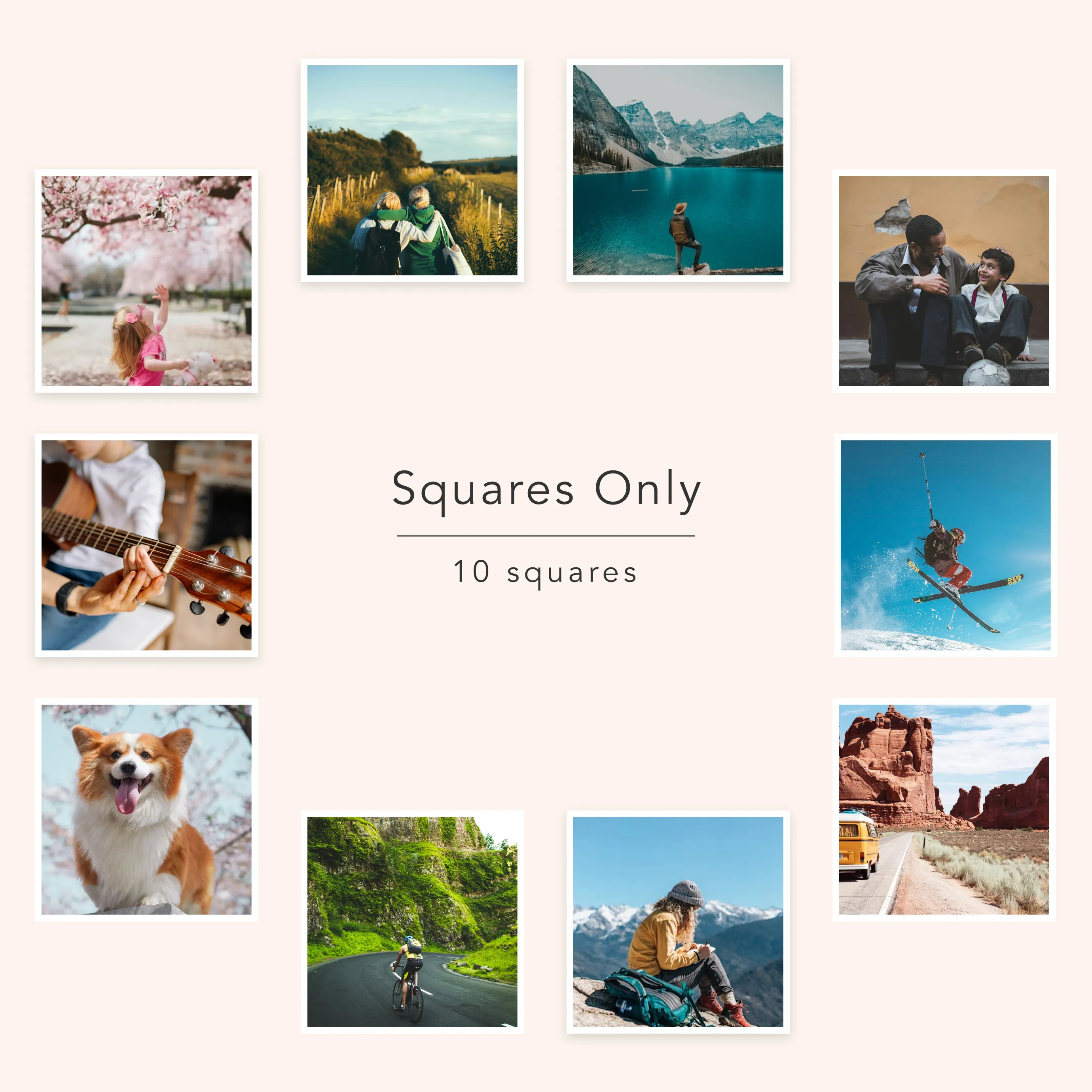 Print eindelijk je foto’s weer uit met de Squares Only Set! Bij dit setje ontvang je 10 van jouw favoriete foto’s in hetzelfde vierkante formaat, supersnel thuisbezorgd en gratis geleverd. De hoge kwaliteit foto’s met de iconische witte randen laten jouw foto’s stralen!
